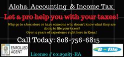- Was gonna try to do my own taxes this year but since I had sold my house last year and didn't know how to report a sale I made a call. I had seen Aloha Income Tax sign by Sea View Circle. Since it was around end of March I was able to get in pretty easy. I found Sonny very friendly he loves to talk! He made me feel at ease right from the beginning. He knows his stuffs! I appreciate all the advise. Contribution to an IRA, 401-K and ways to lower your taxes... and many more. If you haven't tried out Aloha Income Tax, I strongly suggest you give it try!